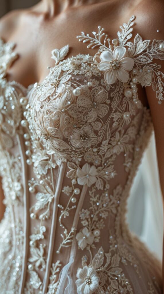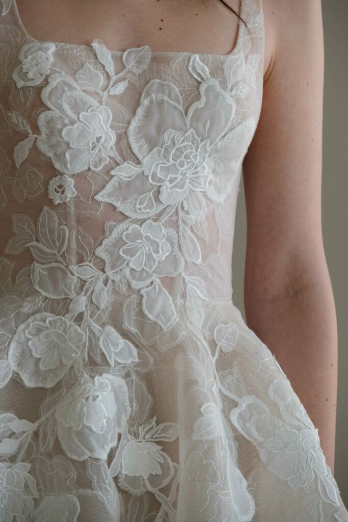 One of the most noticeable 2026 wedding dress trends is texture. Floral appliqués are no longer flat embellishments, they’re dimensional, sculptural, and storybook-like.